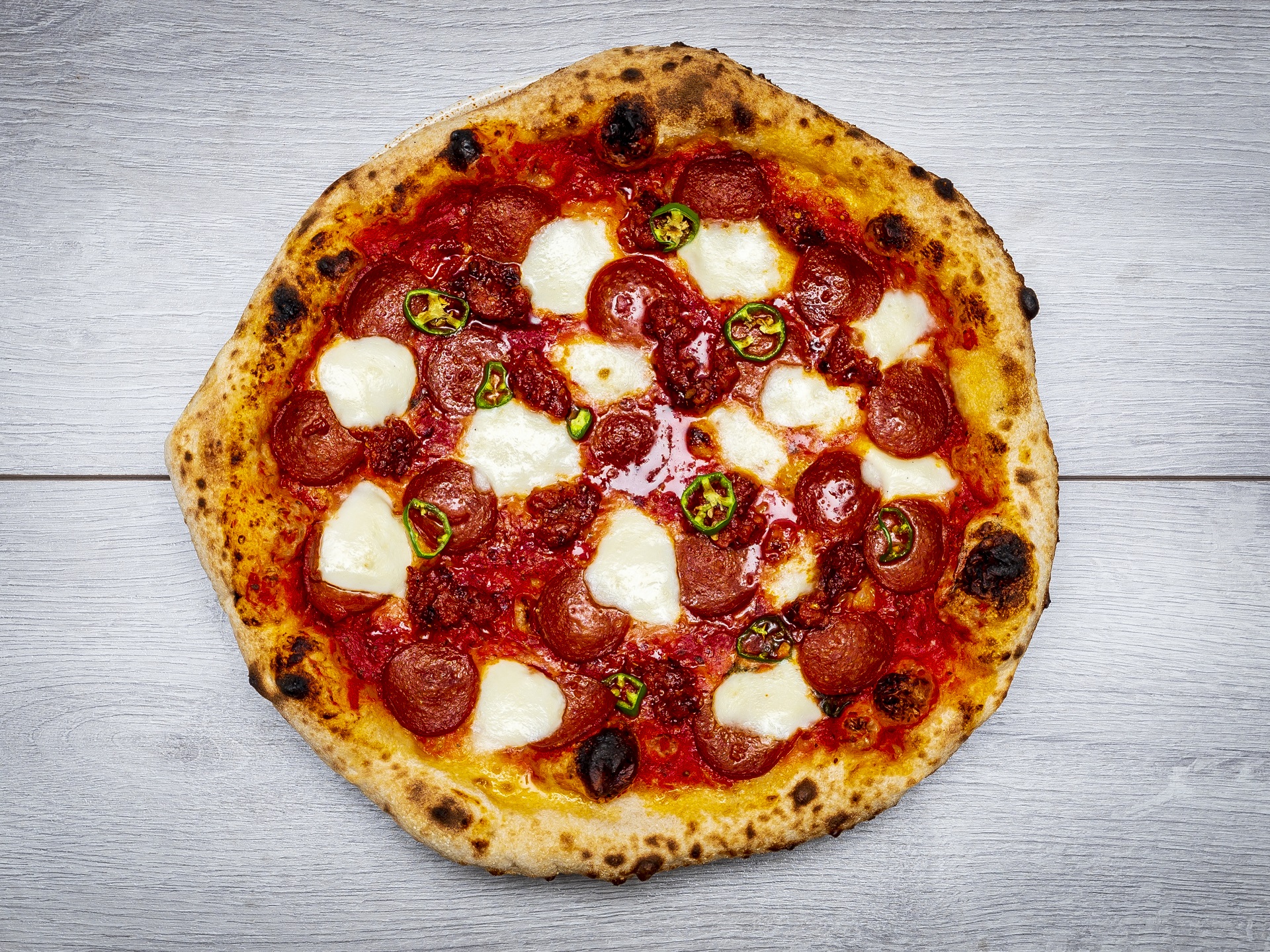 Tomato sauce/ Parmigiano-Reggiano/ Mozzarella/ Pepperoni/ Nduja (IO)/ Fresh Chilli/ Chilli Honey Allergens: 1(Wheat), 7